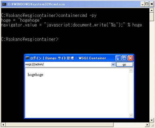 コンテナがSendMessageに対応したこともあり、折角なのでコマンドツールを作ってみた。 E:\>containercmd -py if navigator.value == 'wsgi:///': navigator.value = 'wsgi:///admin/' こんな感じでプロンプトからPythonスクリプトをコンテナに投げつけられ…