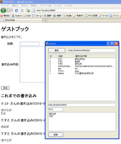 サーバサイド(Python/Django)とクライアントサイド(Delphi)のアプリケーションの連携をやってみる。 今回はゲストブックアプリのデータを、クライアントアプリから閲覧、投稿できるようにしてみる。 サーバサイドの用意 Djangoのアプリケーションは以前作成…