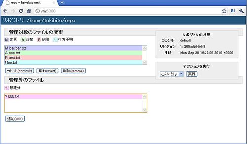 tokibito / flask-hgwebcommit / wiki / Home — Bitbucket 一覧表示にjavascriptで色を付けてみました。 あと、外部コマンドを実行したいときなんかの為にサイドバーにアクション実行を追加しました。 pushやmergeのアクションなんかを作ると面白いかもね。
