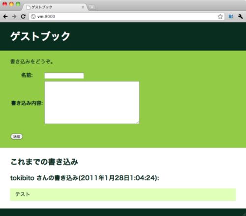 とりあえずDjangoを動かしてみたい人向け? Python-hack-a-thon4で使われなかった(参加者いなかったので)アプリの紹介を今さら。 Djangoをインストール済みの環境であればすぐに動かせます。 Django1.2.4で動作確認。 入手 bitbucketに置いています。 tokibi…