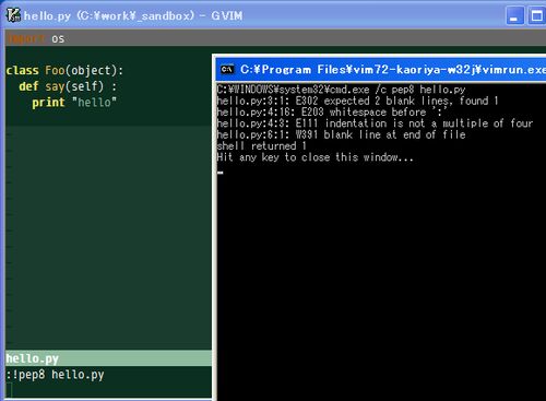 pep8コマンドは引数にファイルを指定して実行するんだけど、vimから楽に使いたいなと思って方法を探してた。 最初にvimのプラグインでやろうと思ったのだけど、入れてみてエラーが出たりするのが結構あったので断念。 単純にコマンド実行をキーにマップする…