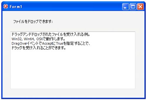 エクスプローラーやFinderからドラッグアンドドロップされたファイルを受け入れる例。 FireMonkeyでもVCLでも一緒なのかな。試したバージョンはDelphiXE3。 DragOverイベントでAcceptにTrueを代入することで、ドラッグを受け入れられる。 ドロップされた際に…