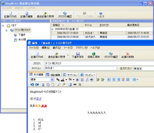 WordPressはXMLRPCに対応しているということで、ブログエディタというものを使ってみた。 使ったのはBlogWriteのフリー版。 すごく使いやすい。JavaScriptのエディタを使うよりも圧倒的に安定しているし、軽い。 これに慣れてしまうと、昨今のブログのWebイ…